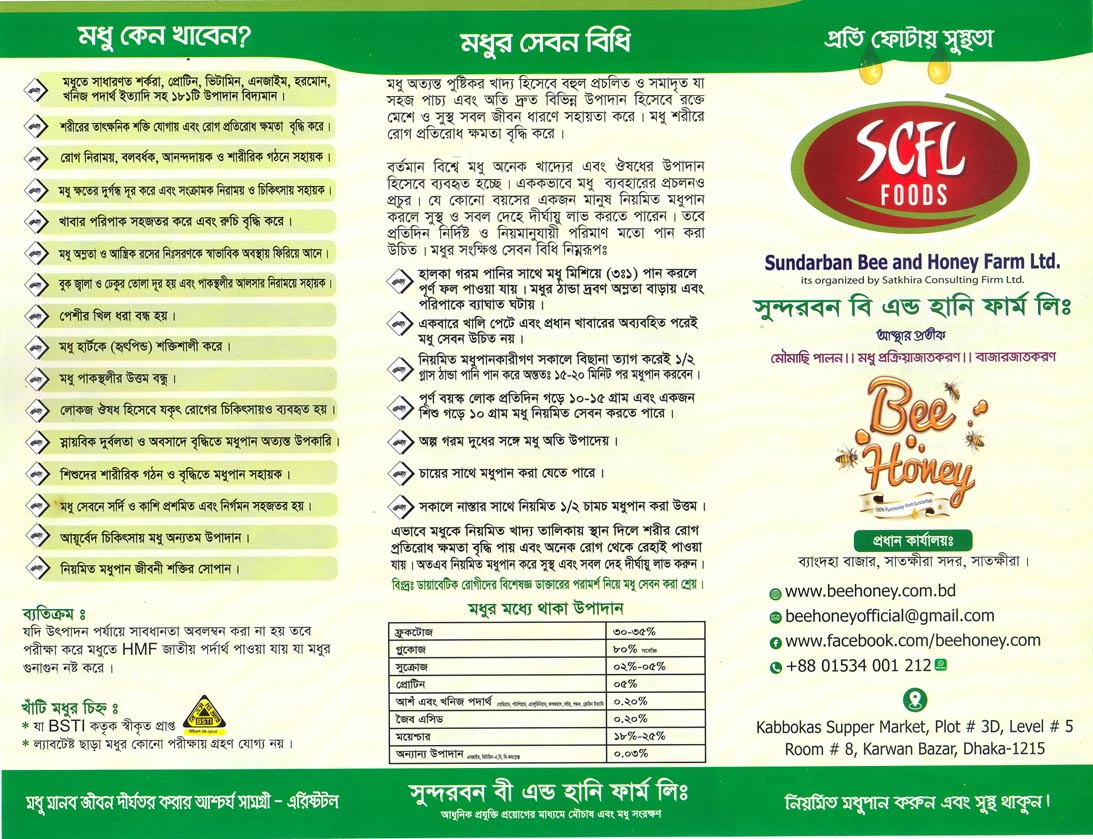 এটি সুন্দরবন বি এন্ড হানি ফার্ম লিঃ- এর নিজস্ব ফার্মের মধু। বাংলাদেশে গাজীপুর, নাটোর, ইশ্বরদি, পাবনা, দিনাজপুর ও যশোরসহ অনেক জেলাতে লিচু ফুলের থেকে প্রায় ৮০ শতাংশ মধু হয় লিচু ফুলের নেকটর থেকে। এই জন্য আমরা নামকরণ করি লিচু ফুলের মধু। লিচু ফুলের মধু জমে যায়। সুন্দরবন বি এন্ড হানি ফাম লিঃ- লিচু ফুলের মধু বৈশিষ্ট্য- ১ . “ বি হানি ” ব্রান্ডের মধু। ২ . প্রসেসিং করা । ৩ . কাচেঁর জারে। ৪ . বাড়তি কোন কিছু মেশানো নেই। ৫. শতভাগ খাঁটি। ৬. চিনি মেশানো হয় না। ৭. শতভাগ প্রাকৃতিক।